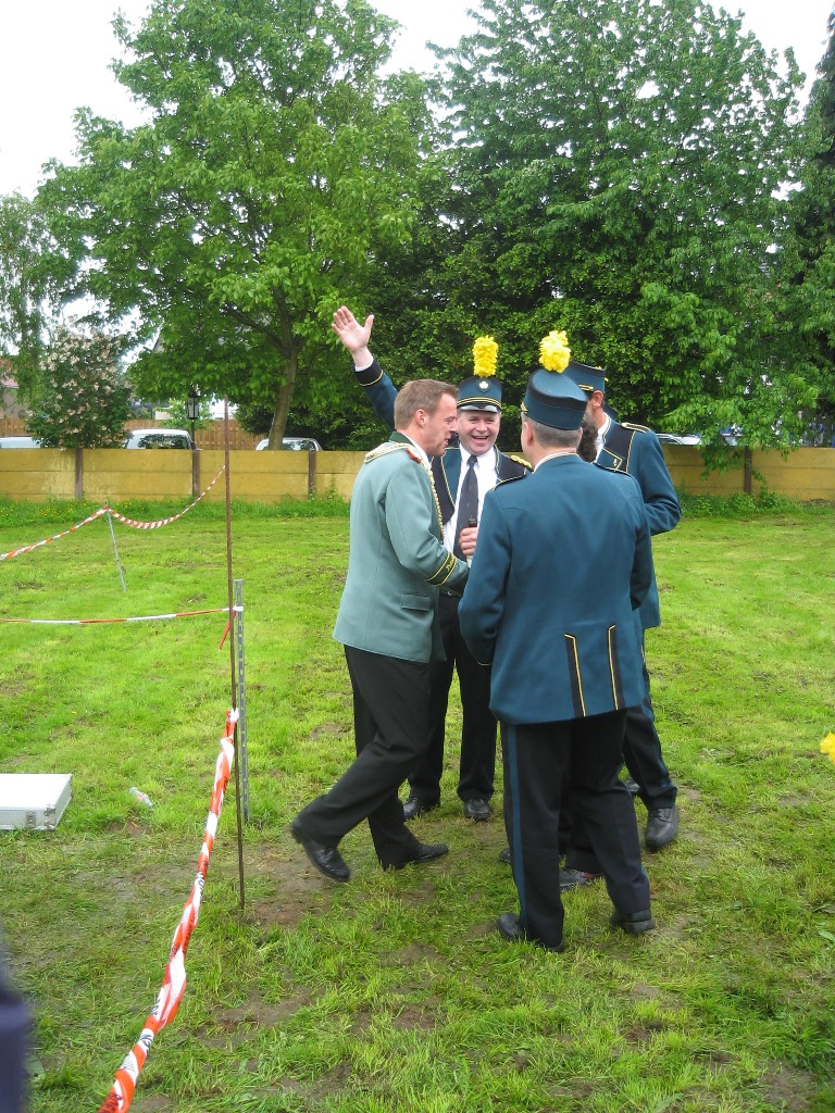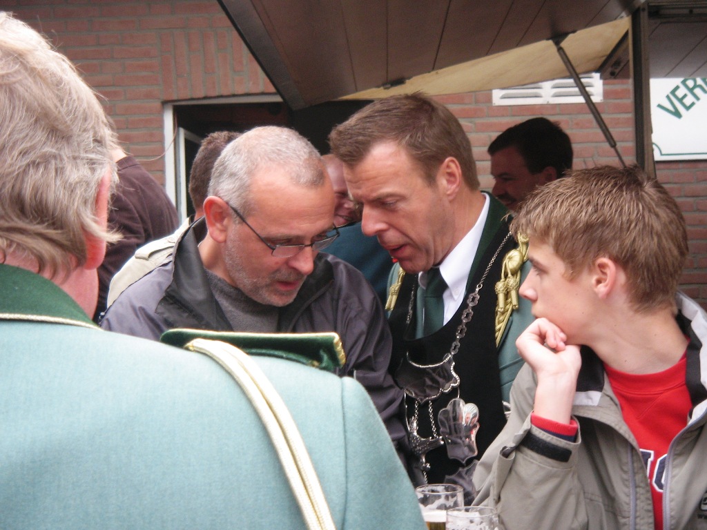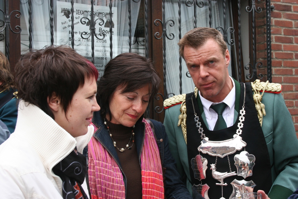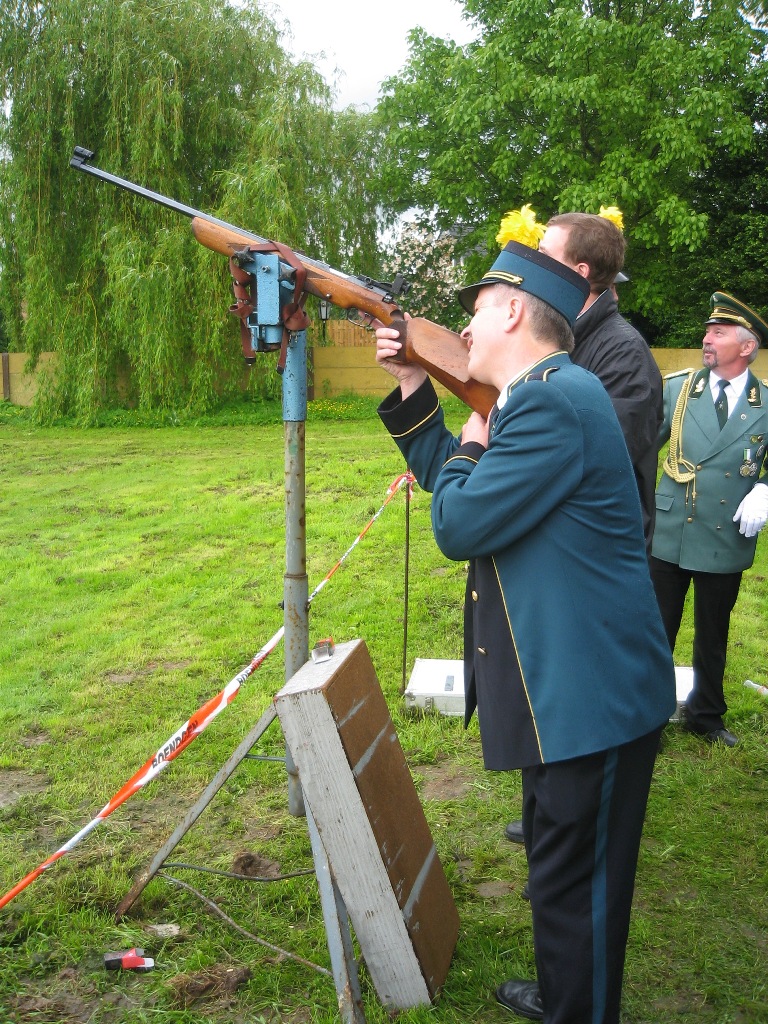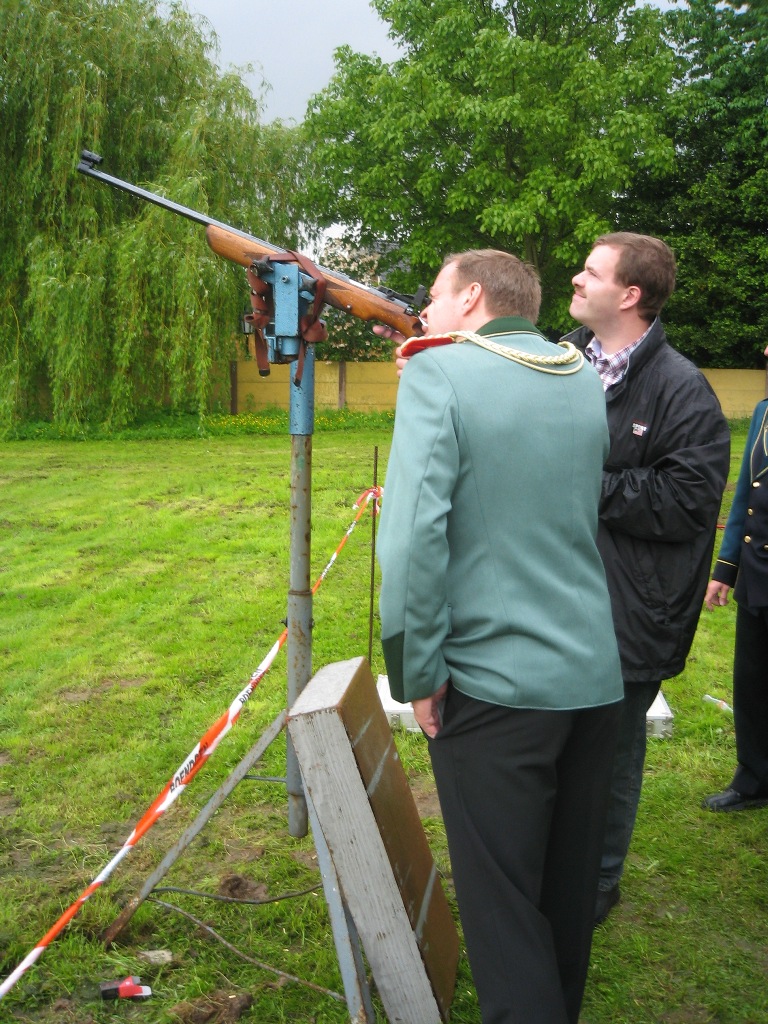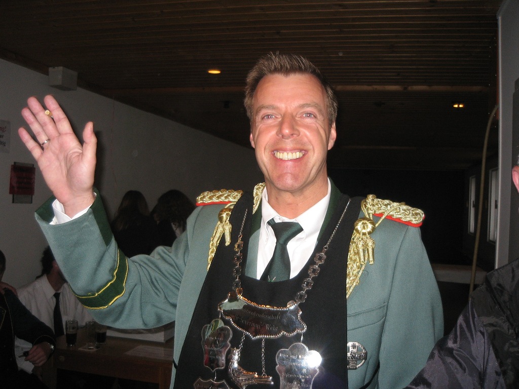 Königsvogelschuß 2006Präsident Georg Wagemans errang die Königswürde24. Mai 2006 - Mit Unterbrechungen wurde der diesjährige Wettbewerb auf der Festweise in Wehr durchgeführt. Einzelne Regenschauer gaben den Schützen jeweils etwas Zeit, sich zu dem nächsten Durchgang neu zu formieren. Der Vorstand wollte die Veranstaltung schon abbrechen, doch dann formierte sich wieder eine Gruppe und legte zum Endkampf an. Nur vereinzelt reihten sich Schützenbrüder in die Reihen der Schützen ein, die überwiegend der Spielmannszug stellte. Als der Jubel erhallte, war es Georg Wagemans, der dem Königsvogel den entscheidenden Schuß verpasst hatte. Nach der Parade versammelte man sich dann zum gemütlichen Teil im Dorfzentrum, wo der neue Schützenkönig noch würdig und lange gefeiert wurde.