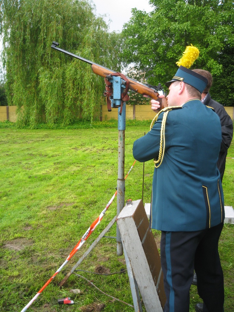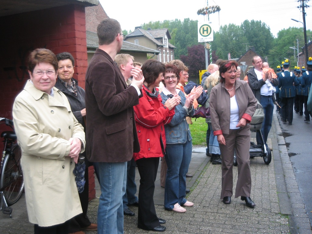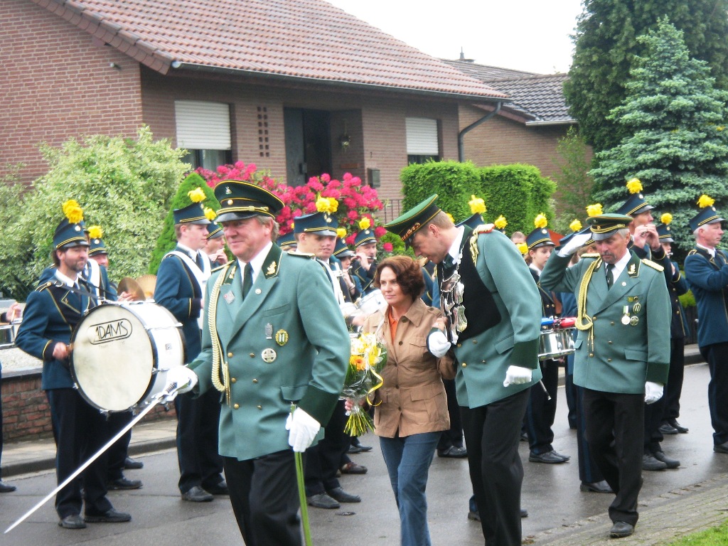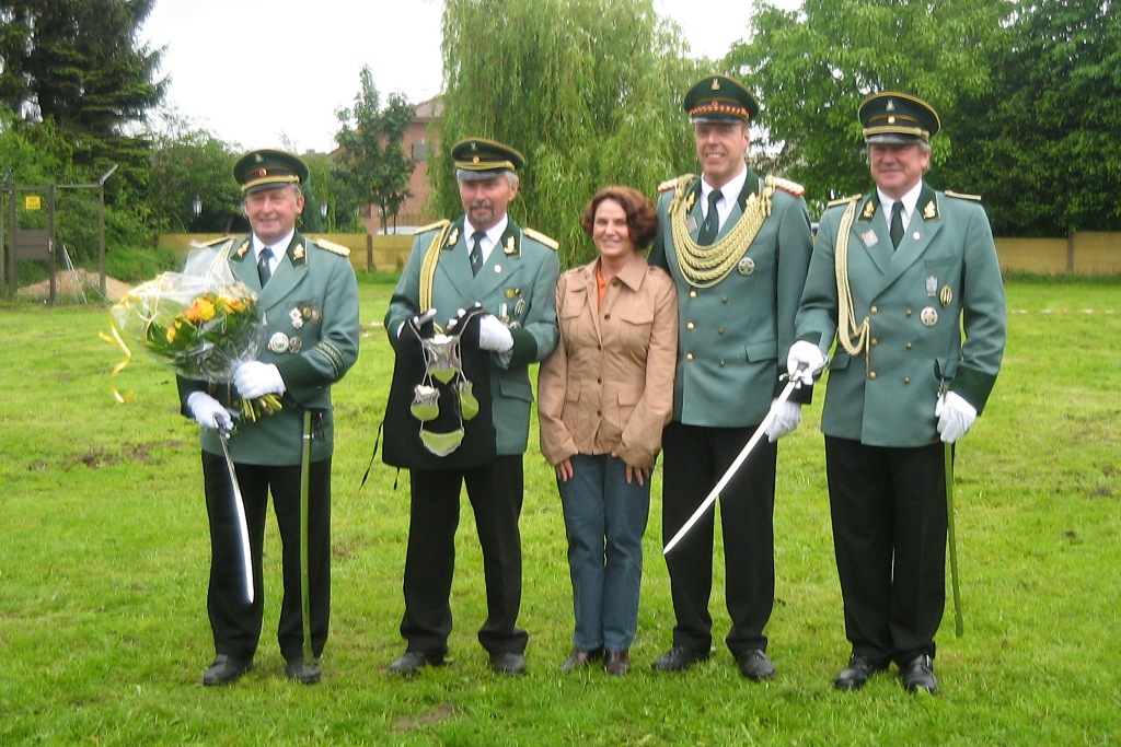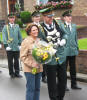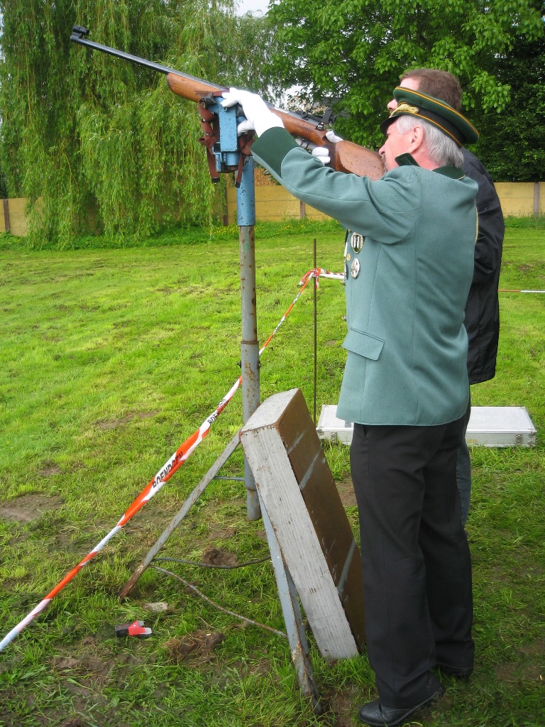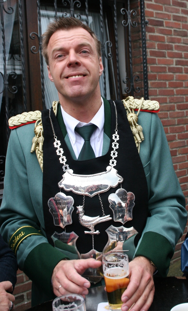 Königsvogelschuß 2006Präsident Georg Wagemans errang die Königswürde24. Mai 2006 - Mit Unterbrechungen wurde der diesjährige Wettbewerb auf der Festweise in Wehr durchgeführt. Einzelne Regenschauer gaben den Schützen jeweils etwas Zeit, sich zu dem nächsten Durchgang neu zu formieren. Der Vorstand wollte die Veranstaltung schon abbrechen, doch dann formierte sich wieder eine Gruppe und legte zum Endkampf an. Nur vereinzelt reihten sich Schützenbrüder in die Reihen der Schützen ein, die überwiegend der Spielmannszug stellte. Als der Jubel erhallte, war es Georg Wagemans, der dem Königsvogel den entscheidenden Schuß verpasst hatte. Nach der Parade versammelte man sich dann zum gemütlichen Teil im Dorfzentrum, wo der neue Schützenkönig noch würdig und lange gefeiert wurde.