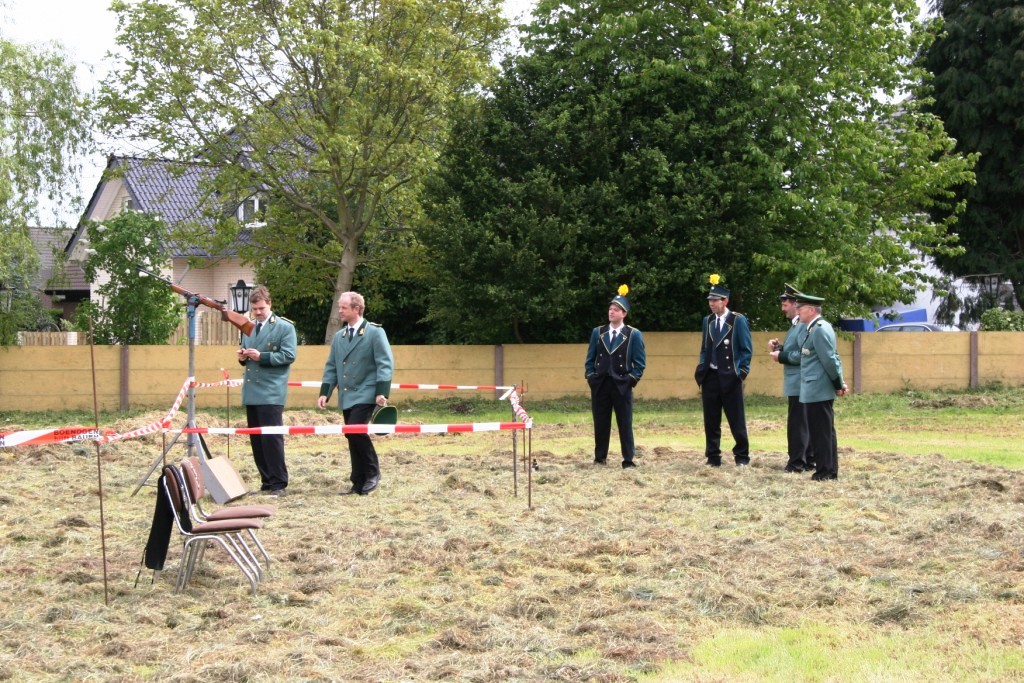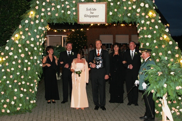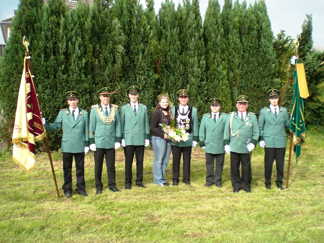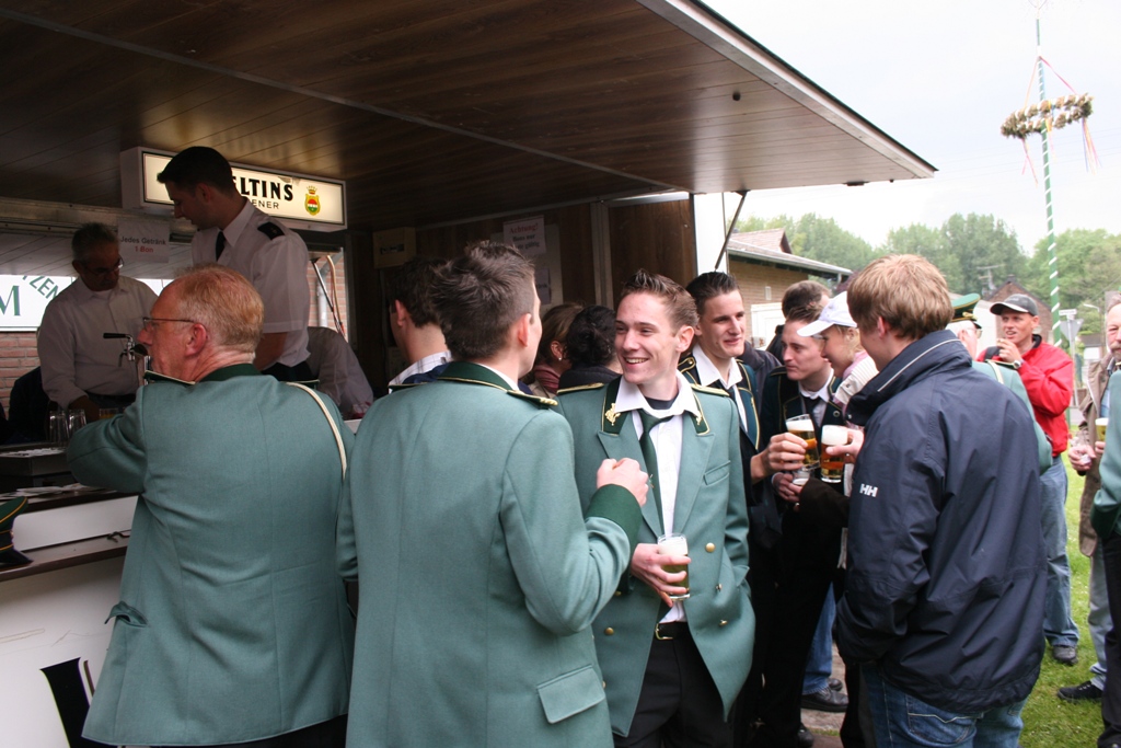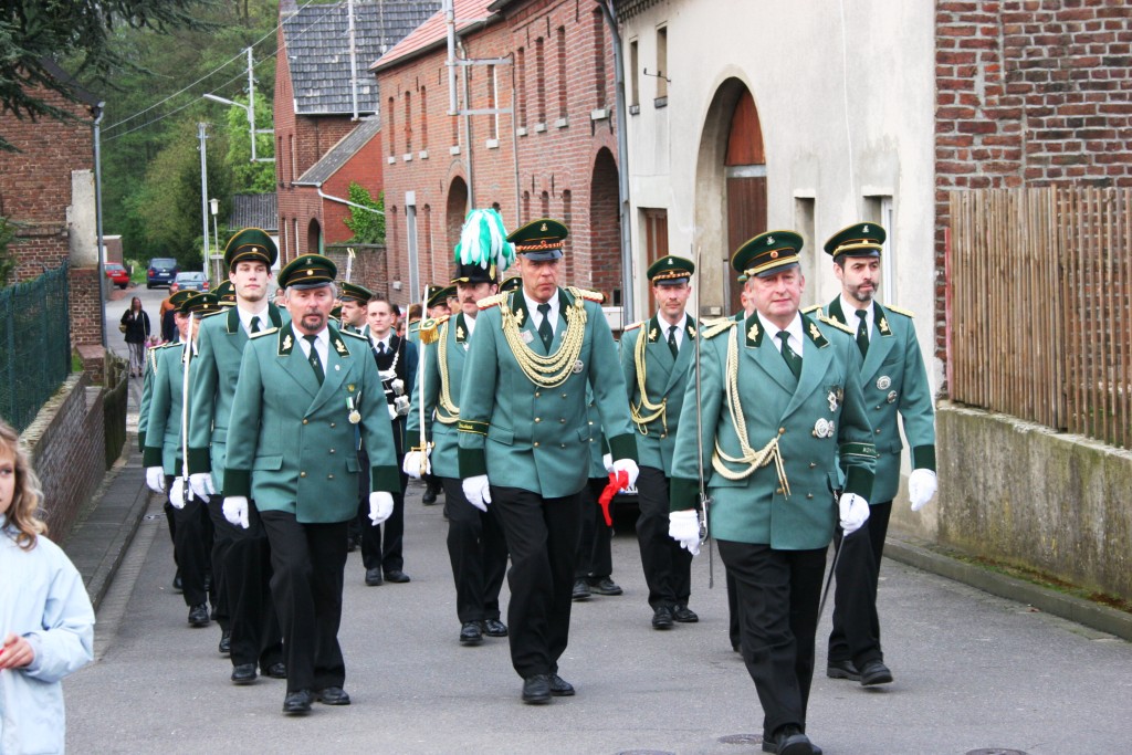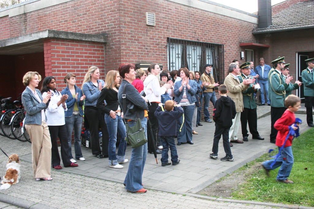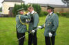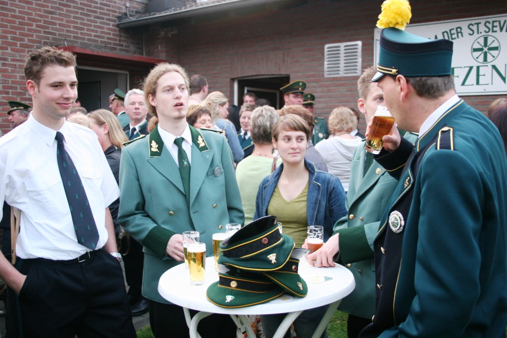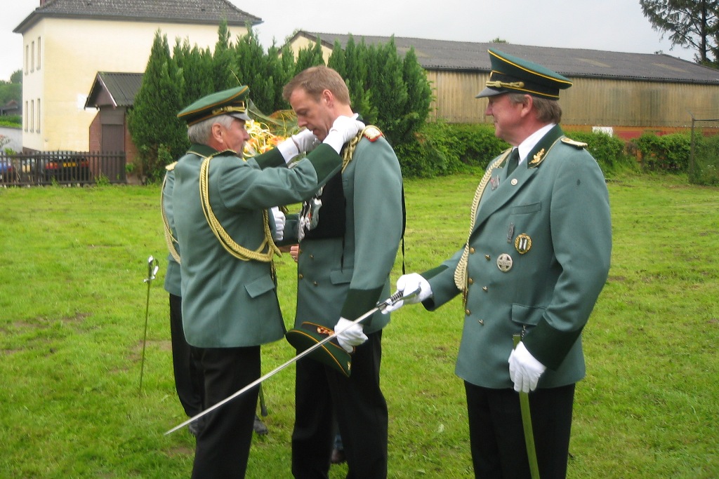 Königsvogelschuß 2006Präsident Georg Wagemans errang die Königswürde24. Mai 2006 - Mit Unterbrechungen wurde der diesjährige Wettbewerb auf der Festweise in Wehr durchgeführt. Einzelne Regenschauer gaben den Schützen jeweils etwas Zeit, sich zu dem nächsten Durchgang neu zu formieren. Der Vorstand wollte die Veranstaltung schon abbrechen, doch dann formierte sich wieder eine Gruppe und legte zum Endkampf an. Nur vereinzelt reihten sich Schützenbrüder in die Reihen der Schützen ein, die überwiegend der Spielmannszug stellte. Als der Jubel erhallte, war es Georg Wagemans, der dem Königsvogel den entscheidenden Schuß verpasst hatte. Nach der Parade versammelte man sich dann zum gemütlichen Teil im Dorfzentrum, wo der neue Schützenkönig noch würdig und lange gefeiert wurde.