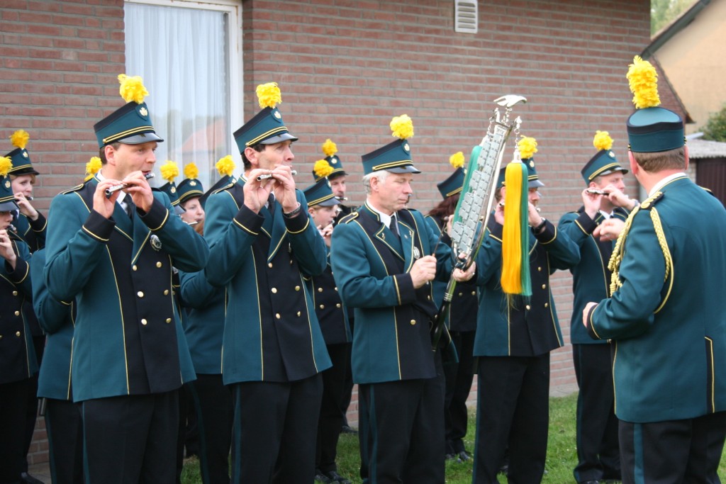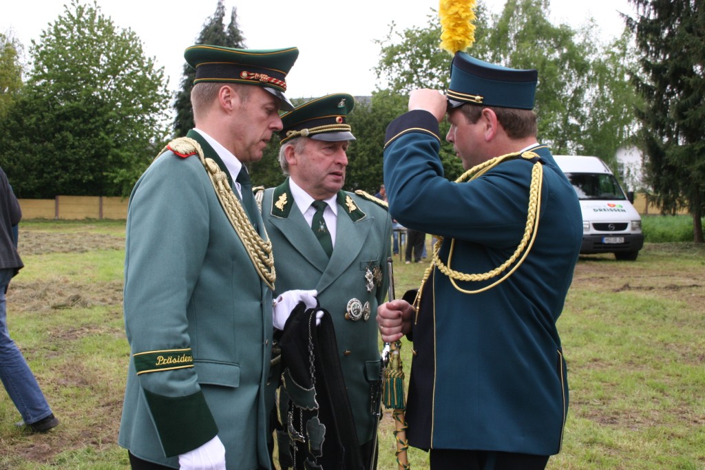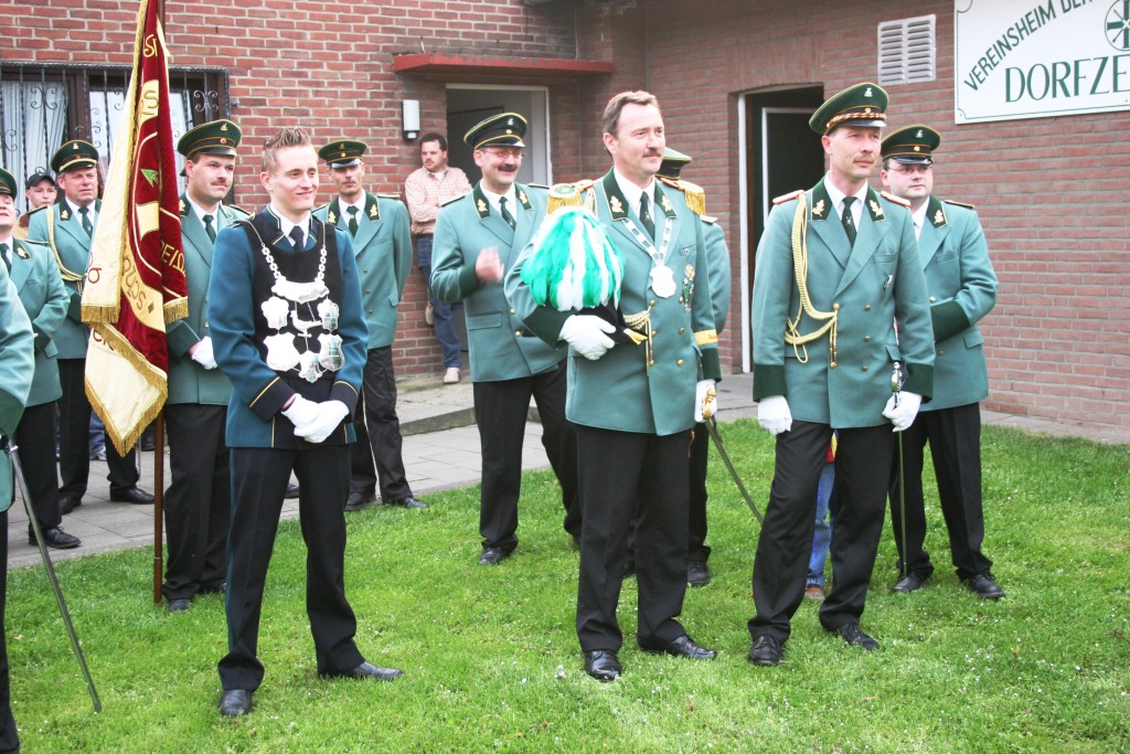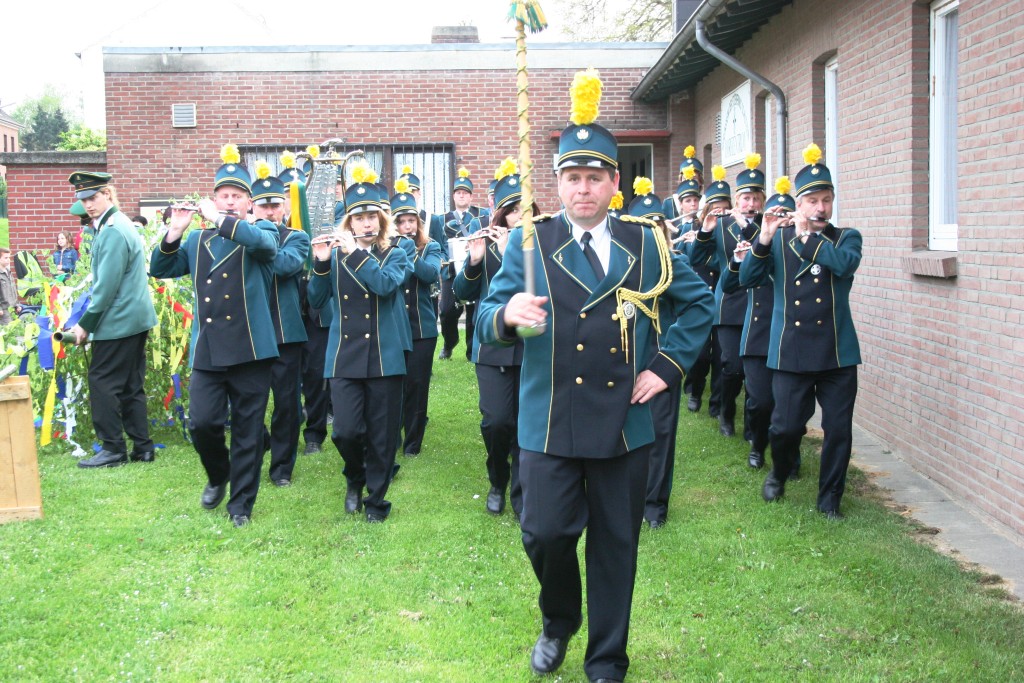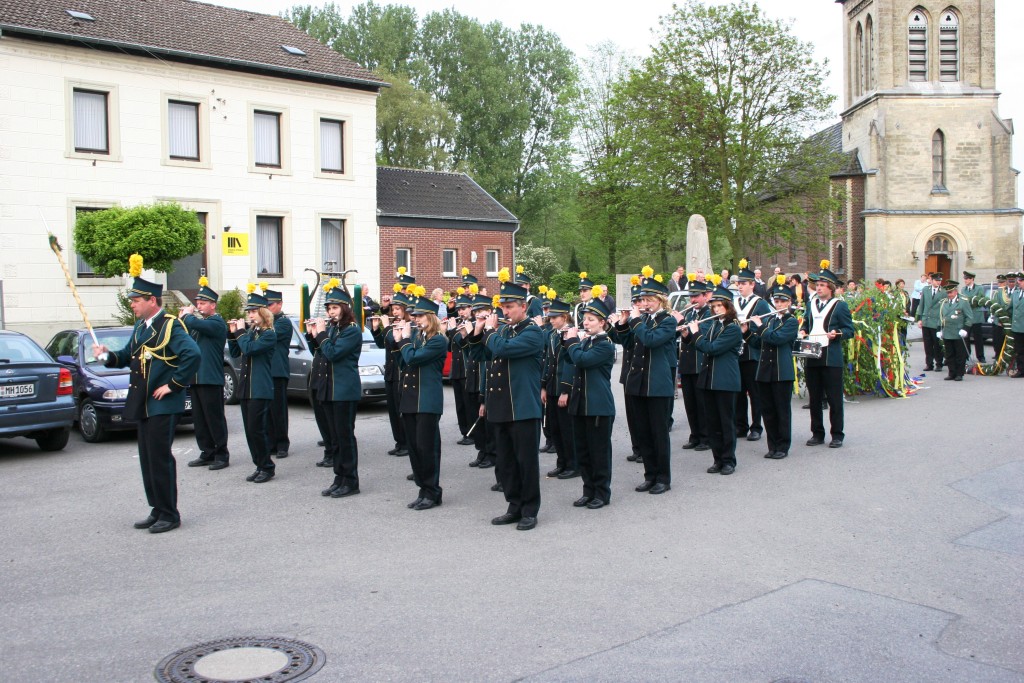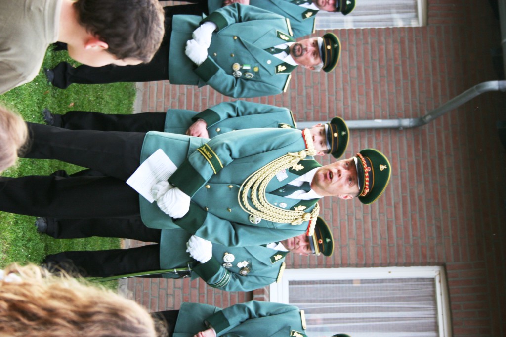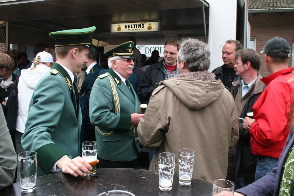 Königsvogelschuß 2006Präsident Georg Wagemans errang die Königswürde24. Mai 2006 - Mit Unterbrechungen wurde der diesjährige Wettbewerb auf der Festweise in Wehr durchgeführt. Einzelne Regenschauer gaben den Schützen jeweils etwas Zeit, sich zu dem nächsten Durchgang neu zu formieren. Der Vorstand wollte die Veranstaltung schon abbrechen, doch dann formierte sich wieder eine Gruppe und legte zum Endkampf an. Nur vereinzelt reihten sich Schützenbrüder in die Reihen der Schützen ein, die überwiegend der Spielmannszug stellte. Als der Jubel erhallte, war es Georg Wagemans, der dem Königsvogel den entscheidenden Schuß verpasst hatte. Nach der Parade versammelte man sich dann zum gemütlichen Teil im Dorfzentrum, wo der neue Schützenkönig noch würdig und lange gefeiert wurde.