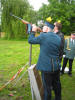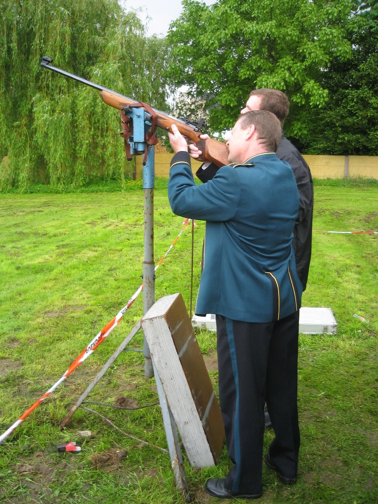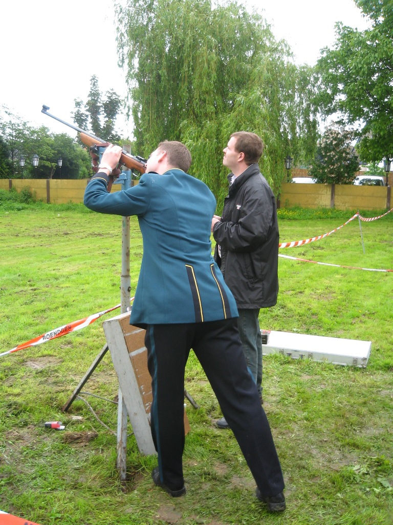 Königsvogelschuß 2005Kevin Bex ist der neue Würdenträger der St. Severinus Schützenbruderschaft Wehr.5. Mai 2005 - Bereits um 13:30 Uhr mussten sich Spielmannszug und Schützenbruderschaft heute am Dorfzentrum einfinden und zum traditionellen Vogelschuß antreten. Nach einer kurzen Andacht zog man dann zur Schützenwiese, wo der Königsvogel schon bereit stand. Aus witterungstechnischen Gründen wichen die Verantwortlichen von einigen Traditionen ab; der Königsvogel stand diesmal sehr einsam auf der Schützenwiese, weil die üblichen Einrichtungen für das Wehrer Wiesenfest diesmal von der Wiese ins Pfarrheim verlegt worden waren. Auch der Wettkampf um den Schülerprinzen wurde kurzfristig mangels Teilnehmer gestrichen, sodass nach den Ehrenschüssen der Wettkampf gleich eröffnet wurde. Nach und nach fanden sich dann einige Interessenten, die reihum dem Königsvogel zusetzten. Mit dem 195 Schuß setzte Kevin Bex dann dem Wettkampf ein Ende und holte den verbliebenen Rumpf des Königsvogels mit einem gezielten Schuß von der Stange.