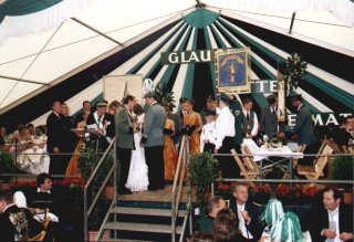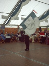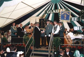 Den Ehrengästen und vielen Zuschauern bot sich hierbei ein farbenprächtiges und stimmungsvolles Bild. Nachdem die Bruderschaft aus Stahe Niederbusch mit der Nummer 24 als letzte an der Festbühne vorbeigezogen war, holte der Spielmannszug Wehr Ehrengäste und Majestäten ab und geleitet sie zum Festzelt. Hier führte dann Dekanatsbundesmeister Heinrich Aretz in gewohnter und gekonnter Manier Regie. Überfüllt war das große Festzelt an der Severinusstrasse, als die Fahnenschwenker ihren Wettkampf austrugen.