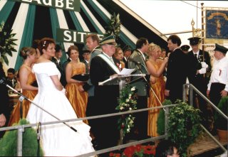 Den Höhepunkt der Sonntags-Nachmittags-Veranstaltung bilden dann, wie immer, der Tanz der Majestäten auf dem Festzelt. Zunächst forderte Herr Aretz zum Tanz der Ehrendamen auf, danach schlossen sich alle Königpaare an und boten ein stimmungsvolles Bild, das man nur zweimal im Jahr, jeweils auf den Schützenfesten des Dekanates geboten bekommt. Auch für die Majestäten sind dies unvergessliche Momente.