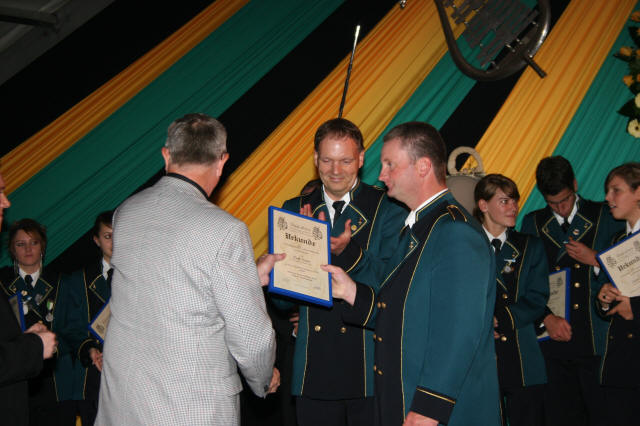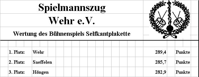 In diesem Jahr gab es zur Wehrer Kirmes ein volles Programm: Am Freitag Abend startete die 4. große 80-Cent-PartyFast 1000 Jugendliche vergnügten sich im riesigen Festzelt bei toller Disco-Musik und Dumping-Preisen bis spät nach Mitternacht. Am Samstag Abend gab es gleich 2 Besonderheiten: Zum einen stellte sich auf dem traditionellen Königsball unser neues Königspaar Georg und Marion Wagemanns vor. KönigsballZum anderen wurde zahlreiche Mitglieder des Spielmannszuges Wehr für Ihre langjährige Mitgliedschaft geehrt. JubilarehrungAm Sonntag hatten wir ebenfalls volles Programm; so startete der Festzug mit der Präsentation des neuen Königspaares bereits um 14:00 Uhr. Gleichzeitig war es aber auch der Festzug des Spielmannszuges aus Anlass des 85-jährigen Bestehens mit 20 Gastvereinen. FestzugNach der Großen Parade mit allen beteiligten Vereinen folgte das Wertungsspiel im Festzelt. Das besondere Highlight war hier die Ausspielung der SelfkantplaketteDie Entscheidung war äußerst knapp, die drei Top Vereine lagen nur 6,5 Punkte auseinander. Es war nicht nur der Heimvorteil, der den Spielmannszug Wehr zum Sieger kürte. Einer der Wertungsrichter vermerkte auf dem Bewertungsbogen: "So wird Musik gemacht".